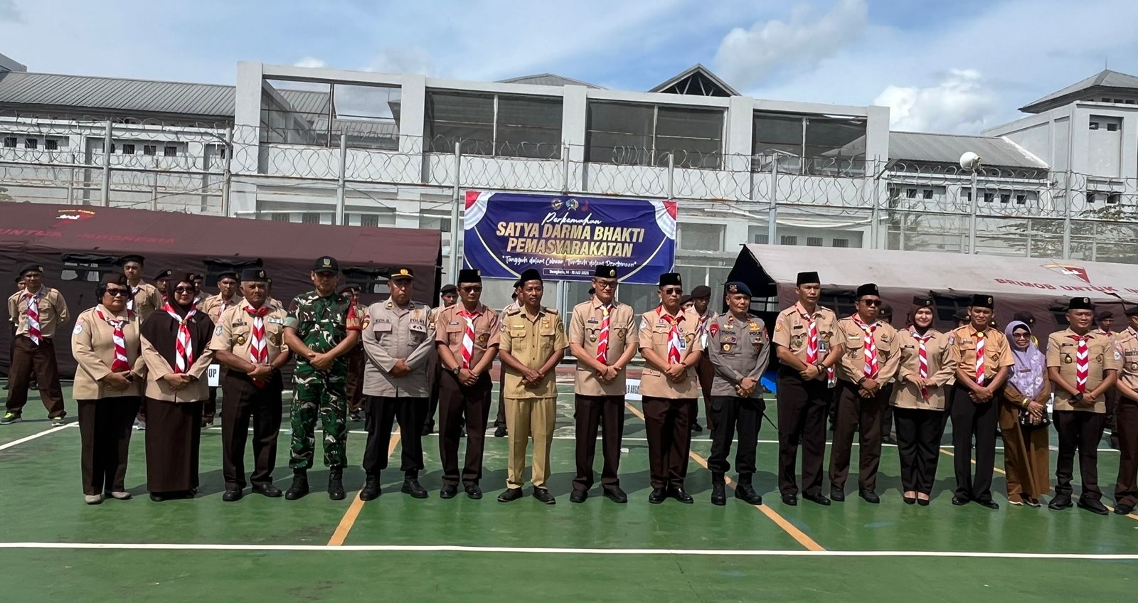 BENGKULU – Berpakaian pramuka lengkap dengan baret dan atributnya, sebanyak 60 warga binaan (Napi, red) dibawah binaan Kanwil Direktorat Jenderal Pemasyarakatan Bengkulu mengikuti kegiatan Perkemahan Satya Darma Bhakti di Lapas kelas II A Bengkulu, Senin (14/7/25).
